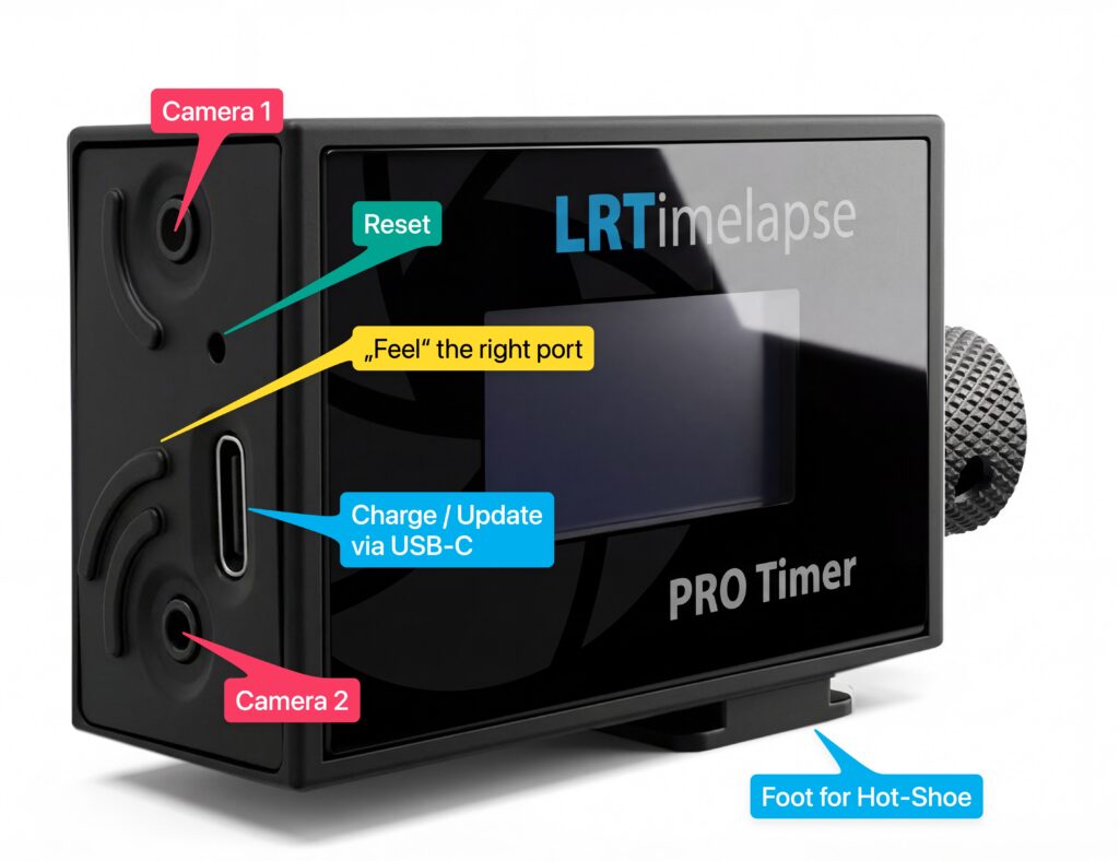 - Built in Li-Ion Battery, which charges via USB-C. You can also power the LRTimelapse PRO Timer via a USB-Powerbank.
